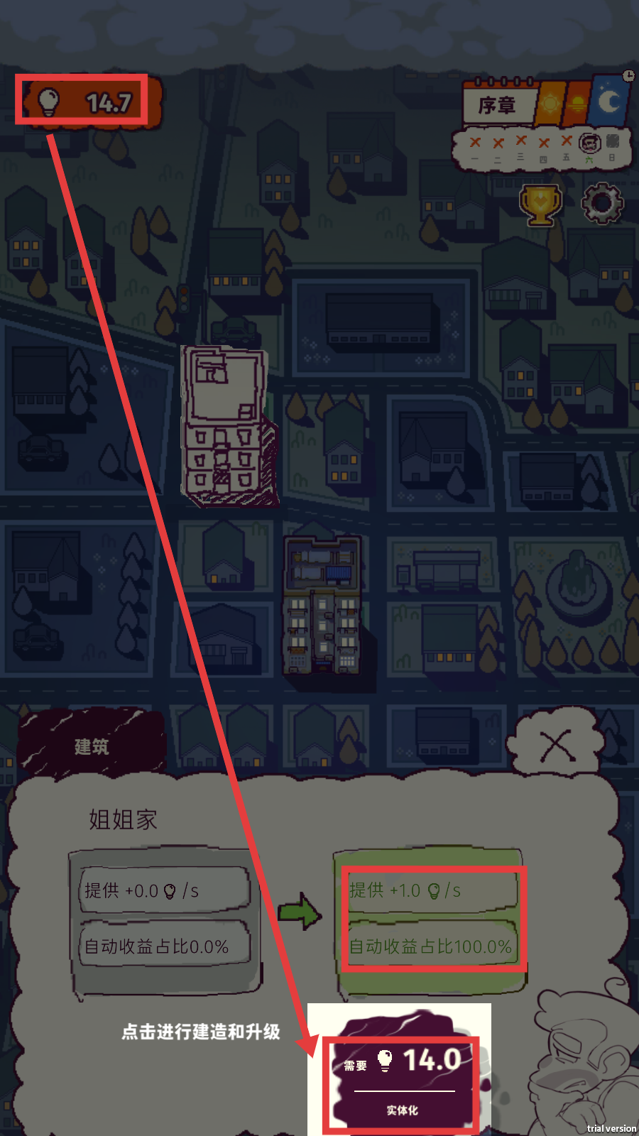 3、积累足够灯泡资源后,点击建筑相关的【实体化】选项(如消耗14.0灯泡),建造并升级建筑,像“姐姐家”能提升自动收益效率。