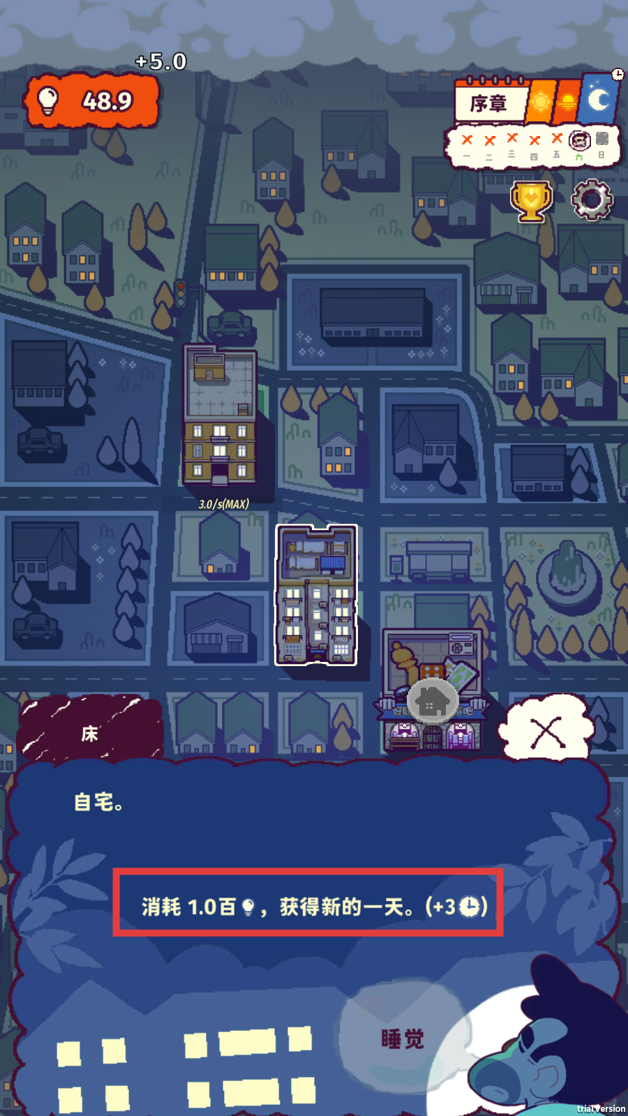 4、消耗1.0百灯泡,可执行【获得新的一天。(+3时间)】操作,推进游戏时间进程,解锁更多游戏内容与玩法。