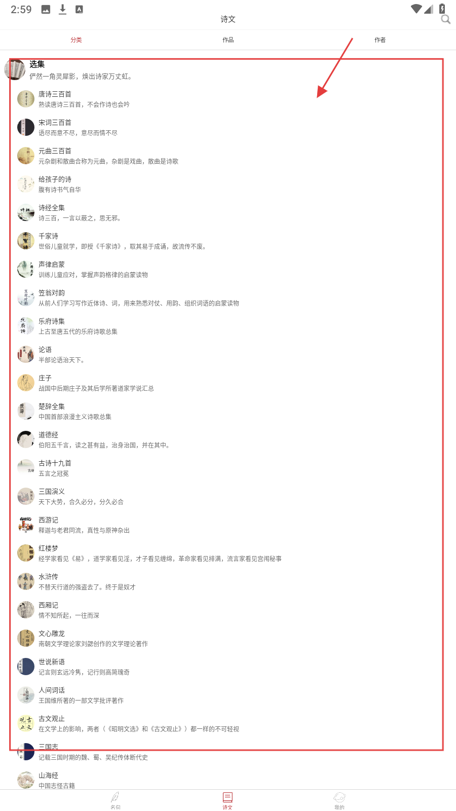 2、切换到【诗文】分类页,这里有《唐诗三百首》等众多选集,挑选感兴趣的诗集。