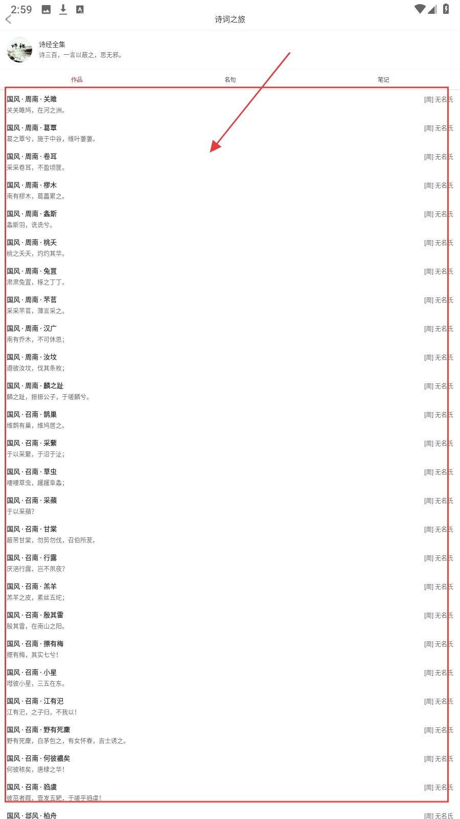 3、进入所选诗集,如《诗经全集》,浏览其中的诗词作品列表,选择想深入学习的诗词。