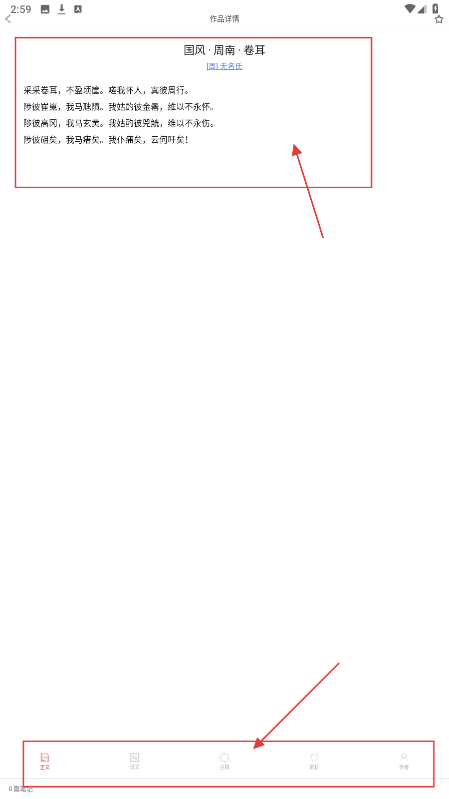 4、点击诗词进入【作品详情】页,可查看诗词正文,还能切换到译文、注释等板块,全面学习诗词。