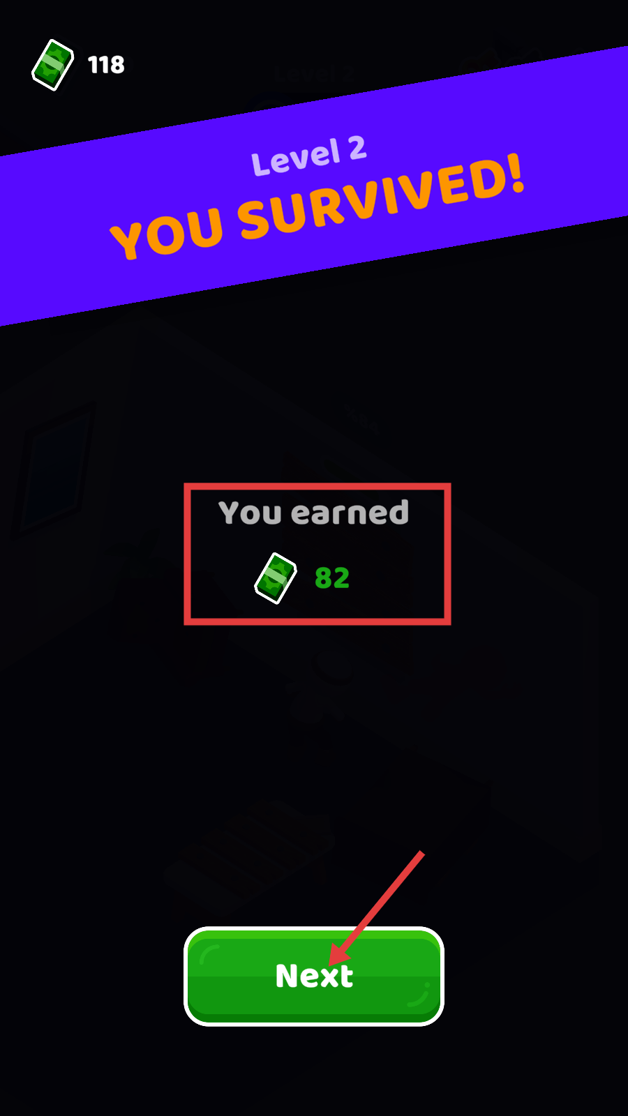 4、成功生存(Level-2-You-Survived!)后,获得【82】货币奖励,点击绿色【Next】按钮进入下一关。
