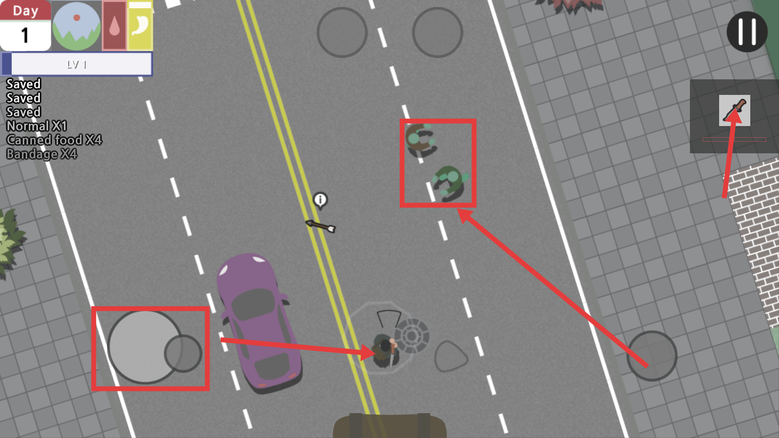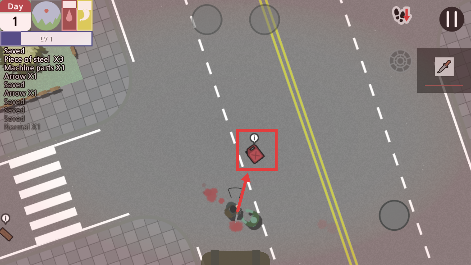 2、冒险中利用左侧虚拟摇杆移动角色,右侧点击武器图标攻击红框标注的怪物,同时注意收集场景内的道具。