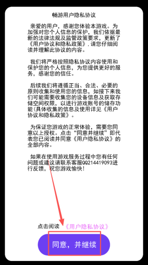1、阅读用户隐私协议,点击“同意,并继续”以授权游戏访问权限。