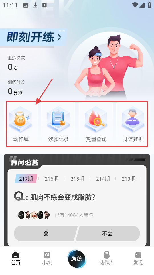 1、进入应用“训练”页面,可看到【动作库】【饮食记录】等功能,点击【动作库】开启动作选择。