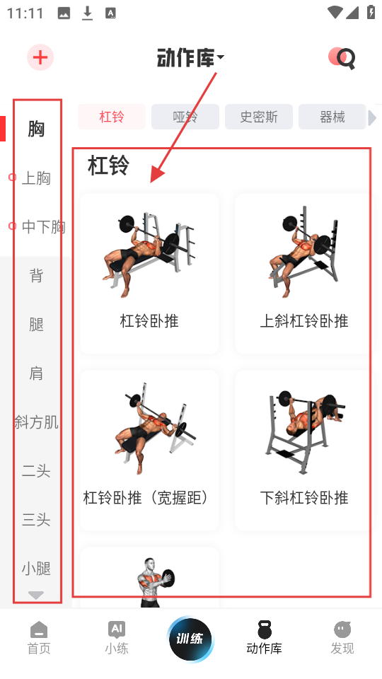 2、在【动作库】里,有“胸”“背”等身体部位分类,选“胸”部,能看到“杠铃卧推”“上斜杠铃卧推”等杠铃训练动作。
