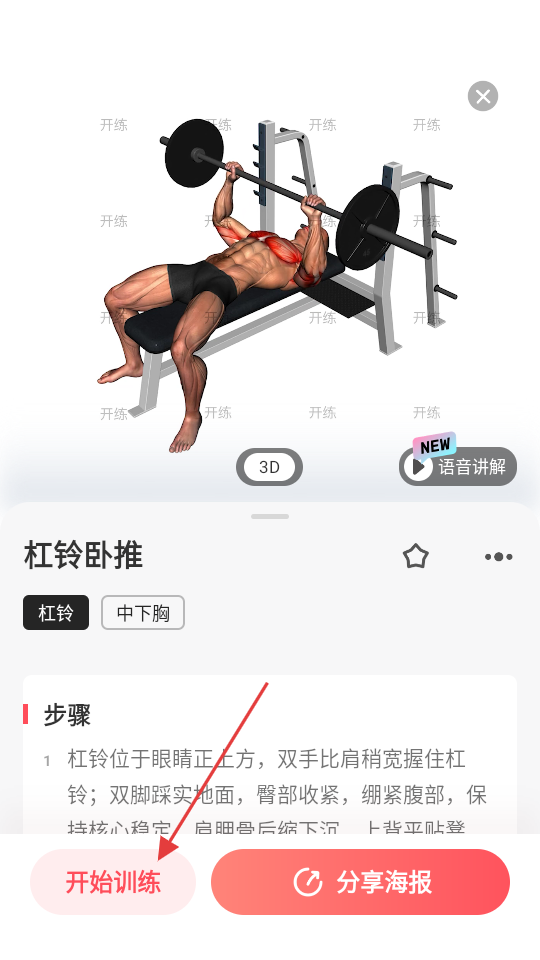 3、点击“杠铃卧推”,进入动作详情页,查看步骤后,点击【开始训练】,进入训练界面。