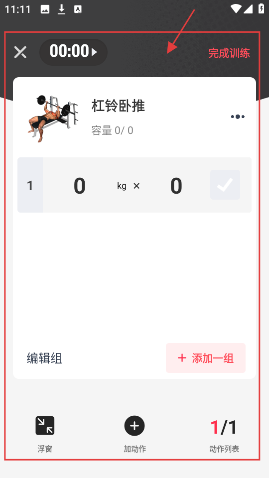 4、在“杠铃卧推”训练界面,可设置重量、次数等,完成训练后点击【完成训练】,结束本次训练。