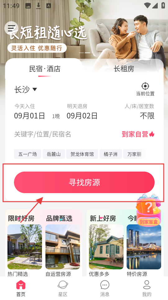 1、进入应用,选择城市、入住和退房日期等信息后,点击【寻找房源】,查找合适的民宿或酒店。