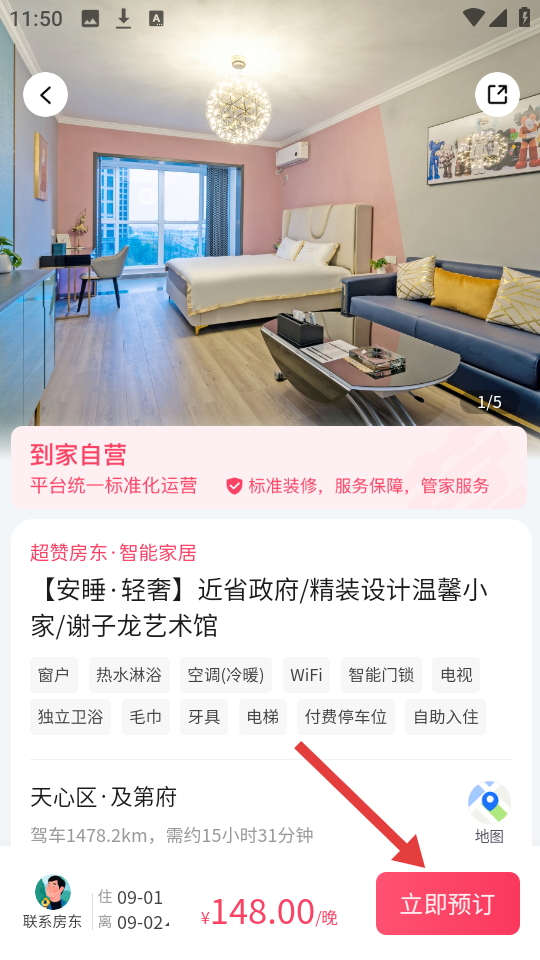 3、进入心仪房源详情页,查看设施、位置等,确认后点击【立即预订】,完成住宿预订。