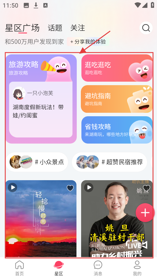 4、进入“星区广场”页面,可浏览【旅游攻略】【逛吃逛吃】等板块,获取旅游、美食等信息,还能分享体验。