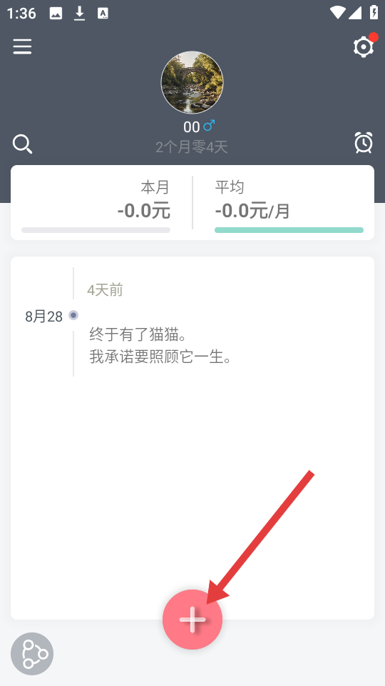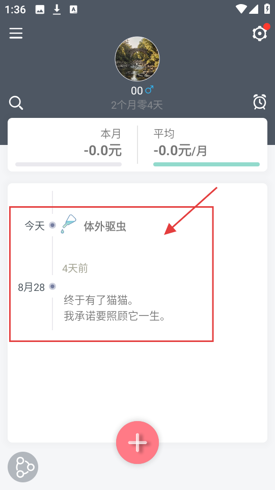 1、进入应用,点击下方【+】,可添加宠物相关记录。