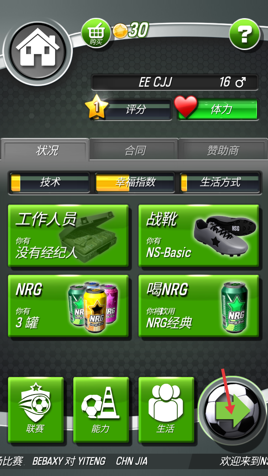 1、在游戏主界面,点击右下角足球样式的箭头按钮,进入足球比赛环节,开启赛事挑战。