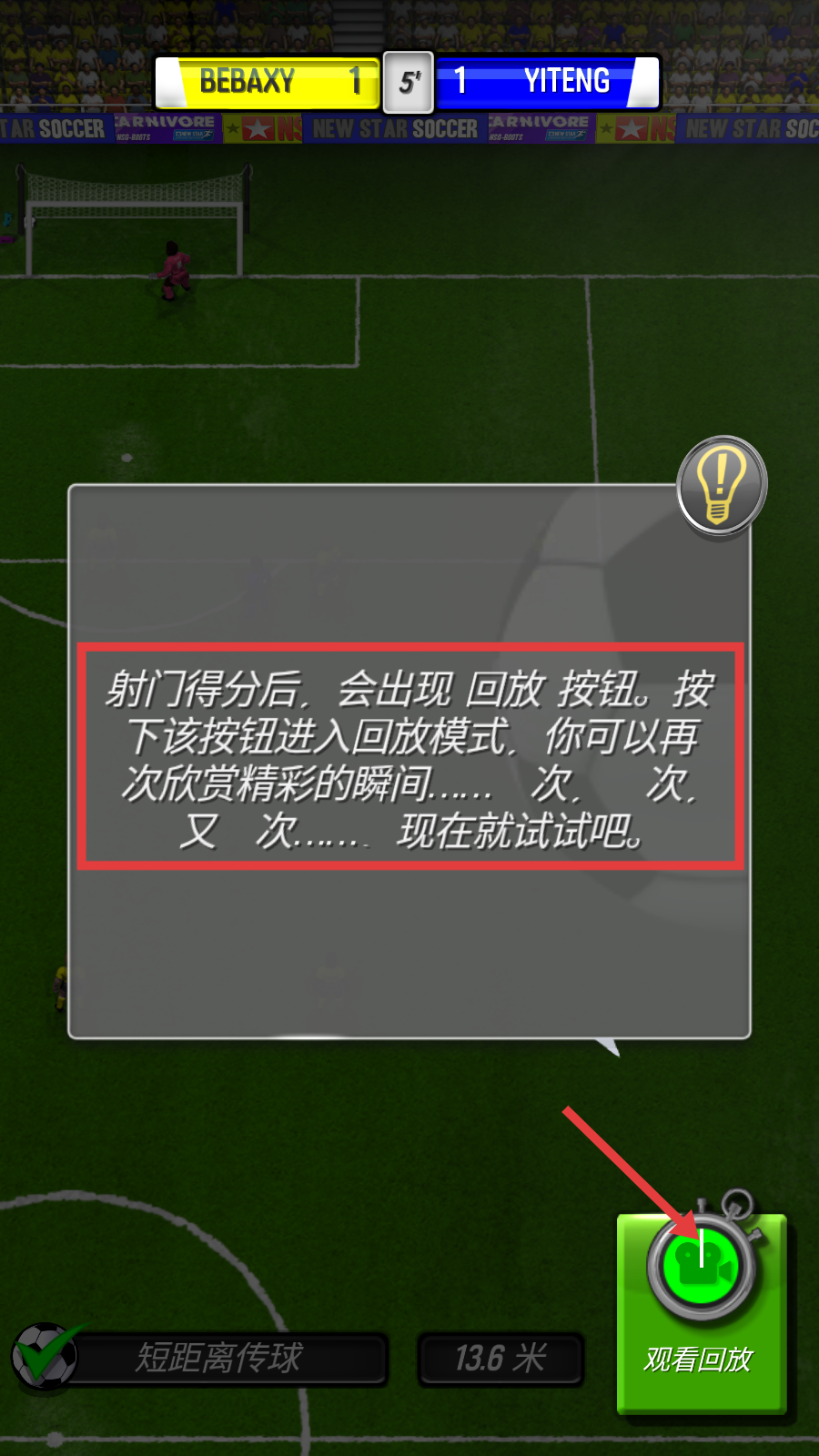 3、射门得分后,点击绿色的【观看回放】按钮,进入回放模式,可多次欣赏进球的精彩瞬间。