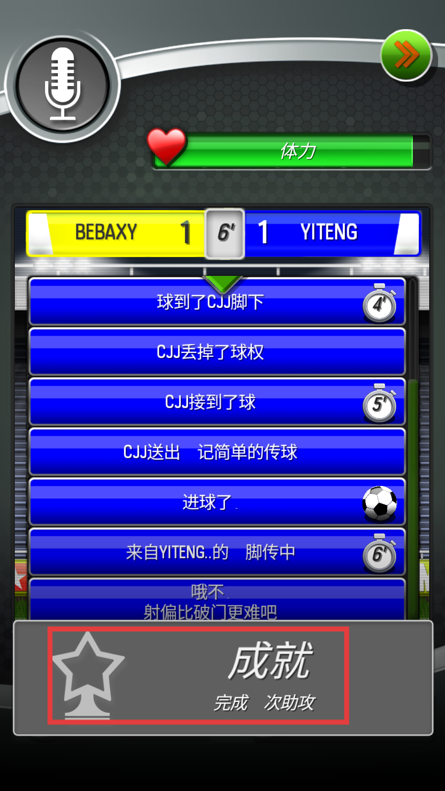 4、比赛过程中,通过传球等操作完成助攻,能解锁【成就-完成次助攻】,积累游戏成就进度。
