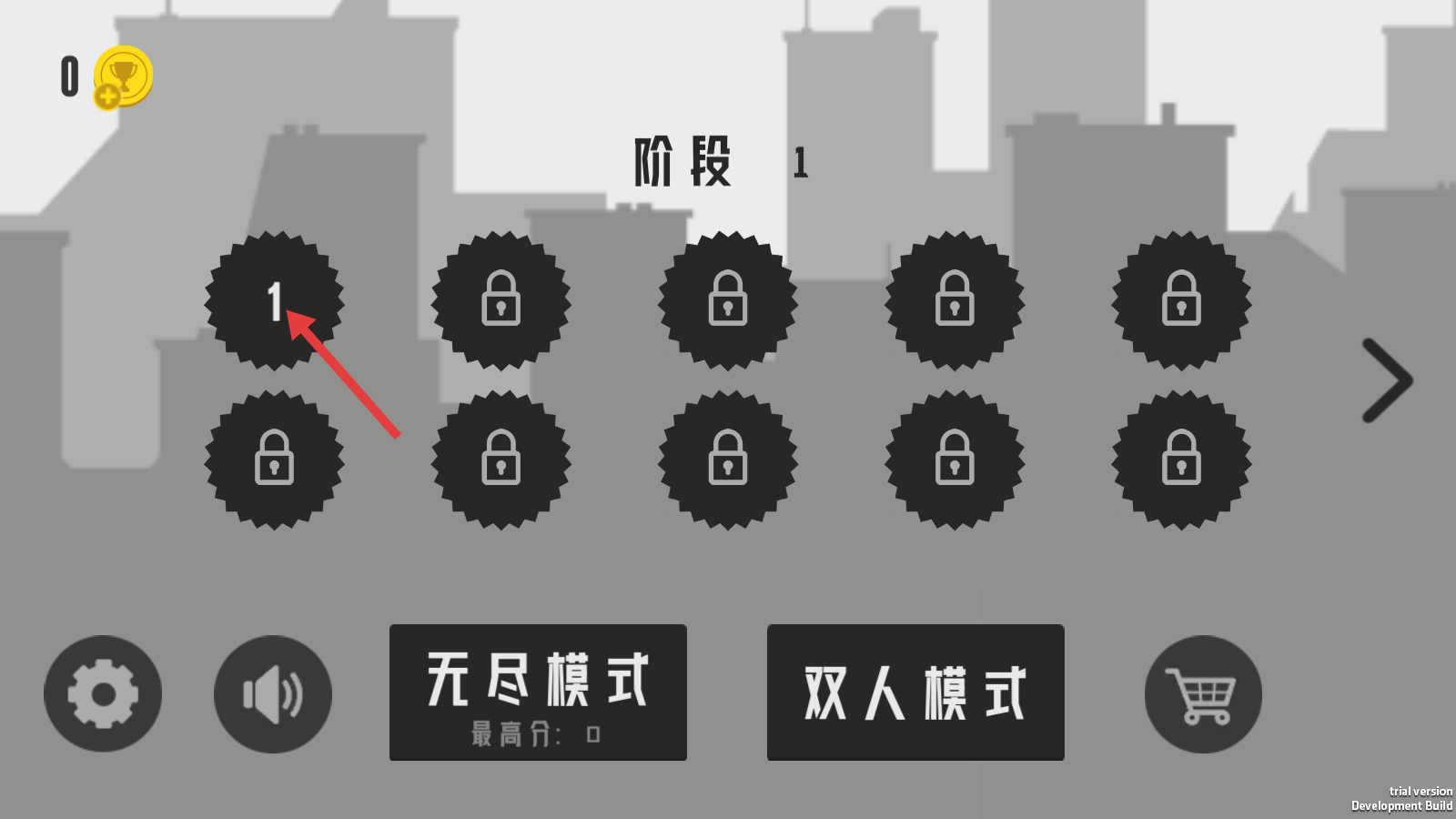 1、点击标有【1】的关卡图标,进入第一关,开启火柴人射箭战斗挑战。