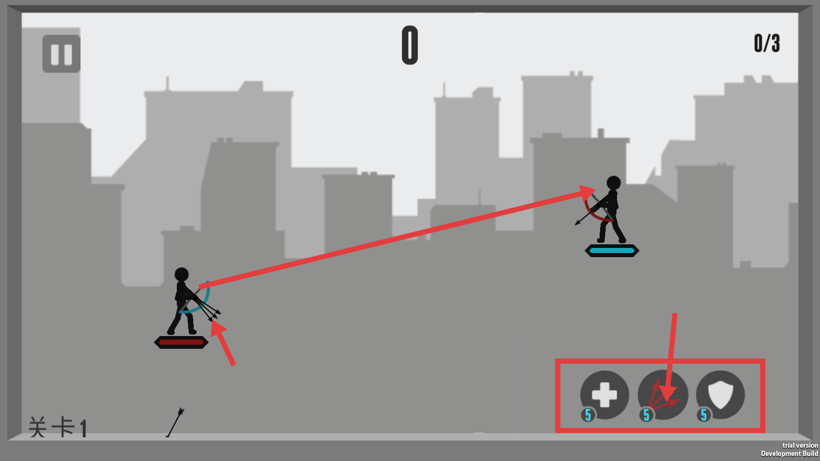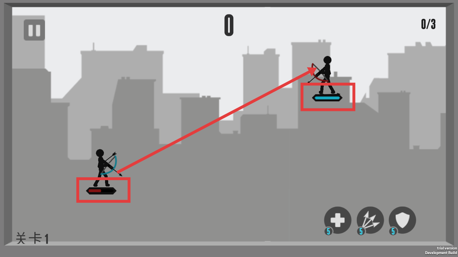 2、关卡1中瞄准站在蓝色平台上的敌方火柴人,利用弓箭射击,发起进攻。