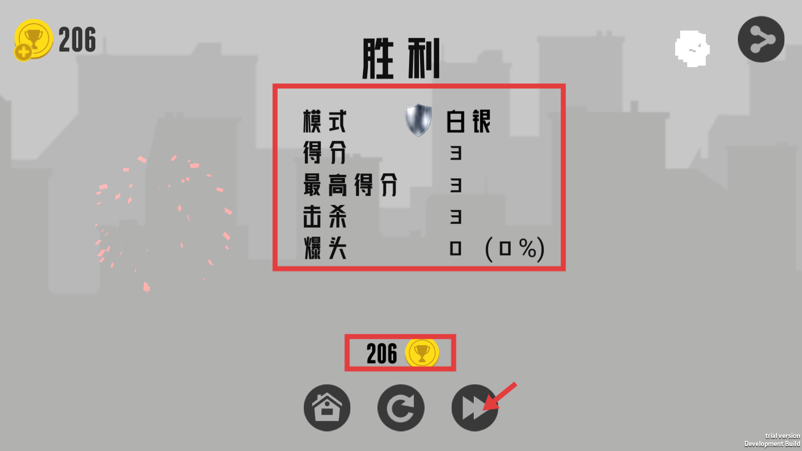 4、成功击败所有敌人后,界面显示【胜利】及战斗数据,获得【206】金币,点击箭头按钮继续下一段流程。