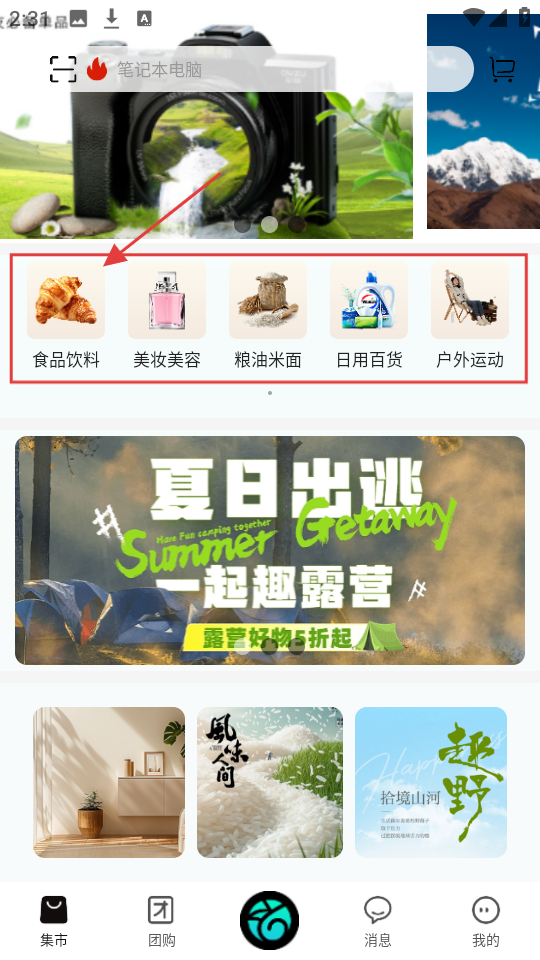 1、进入集市页面,有【食品饮料】【美妆美容】等分类,还有“夏日出逃一起趣露营”等活动推荐,可选购各类商品。