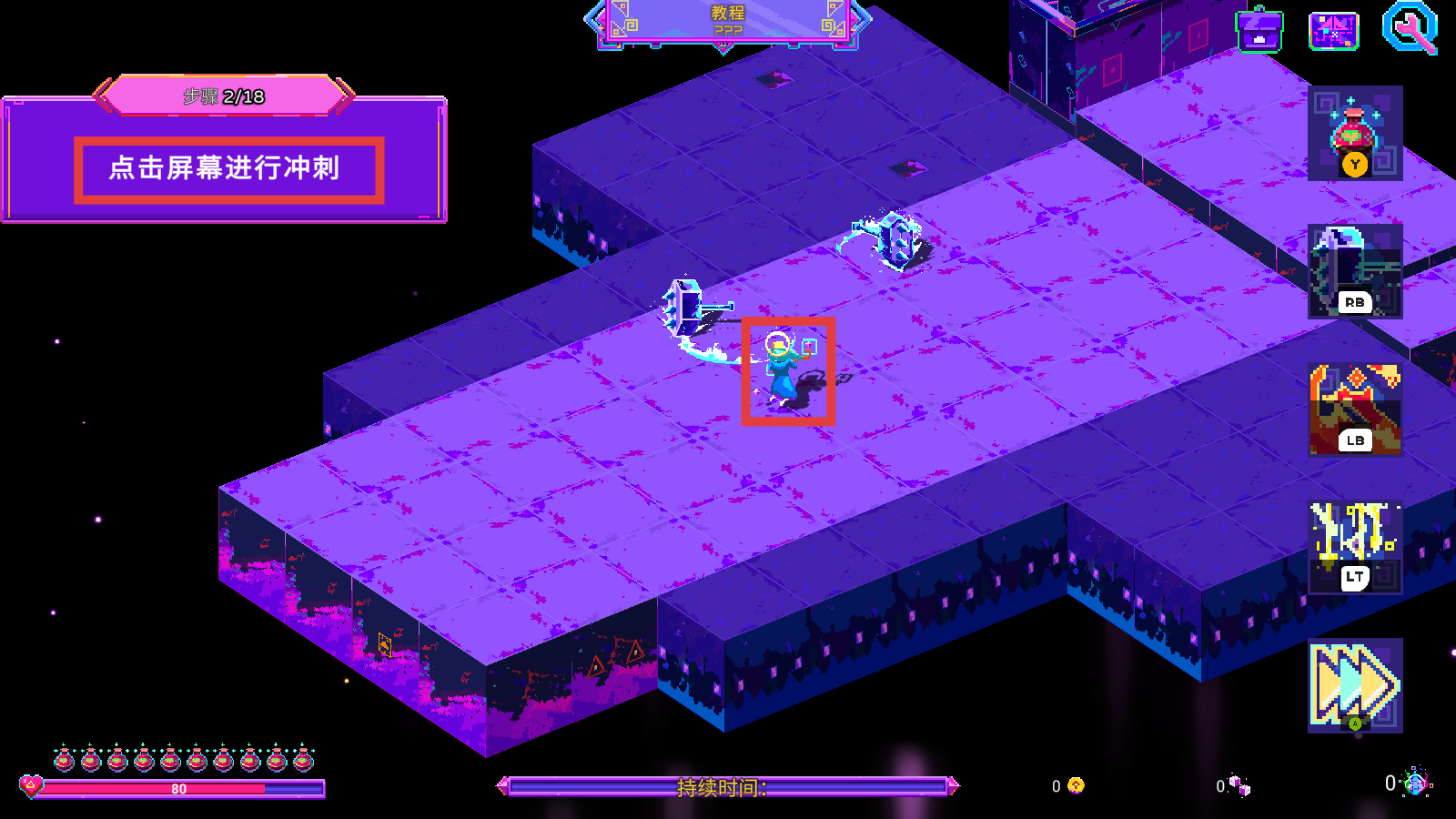 2、教程步骤2/18时,按提示【点击屏幕进行冲刺】,操控角色快速移动,熟悉冲刺操作。