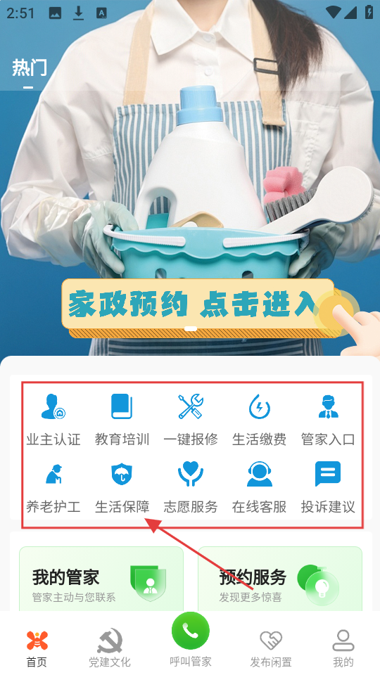 1、进入首页,有【业主认证】【教育培训】【一键报修】等服务功能,还有【家政预约】入口,可点击进入预约家政服务。