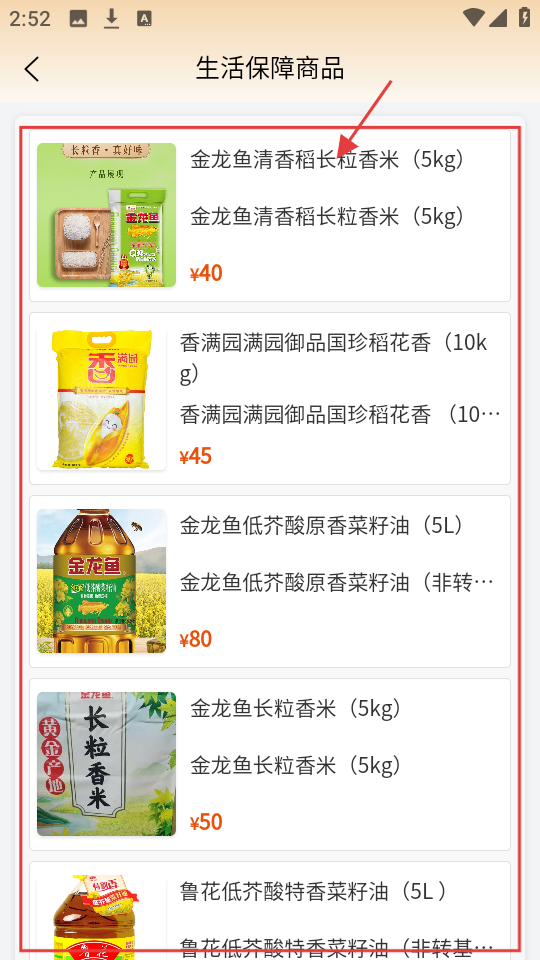 2、进入生活保障商品页面,有【金龙鱼清香稻长粒香米(5kg)】等商品,可挑选购买生活物资。