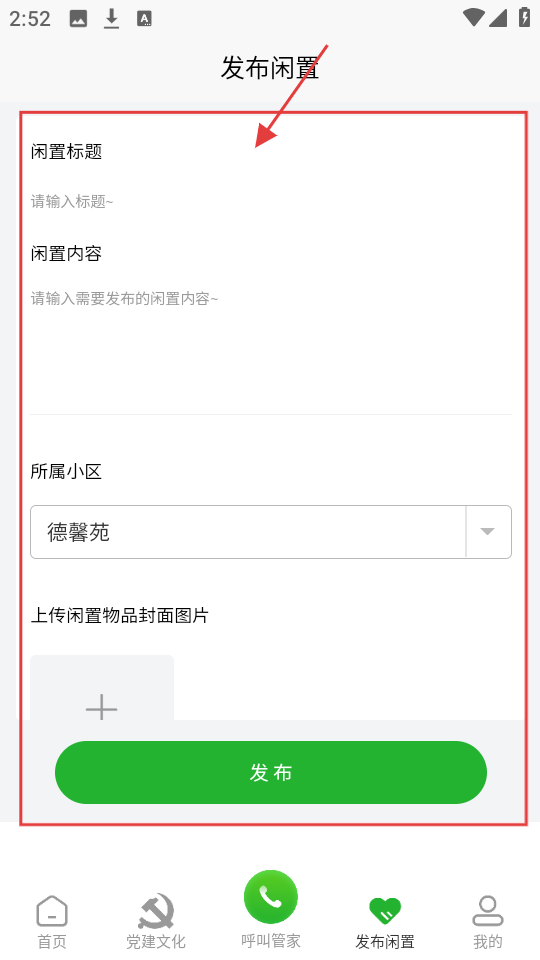 4、进入发布闲置页面,可填写闲置标题、内容,选择所属小区,上传闲置物品封面图片,点击【发布】,分享闲置物品。