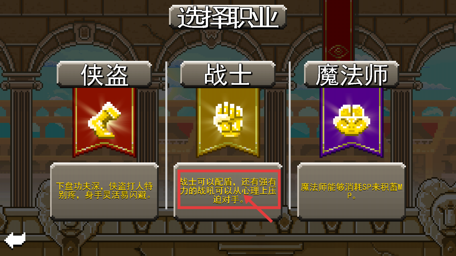 1、选职业时,【侠盗】身手灵活易闪避,【战士】可配盾且战吼能心理压迫对手,【魔法师】能消耗SP积蓄MP,可按需选择。