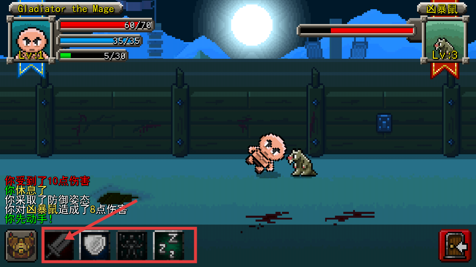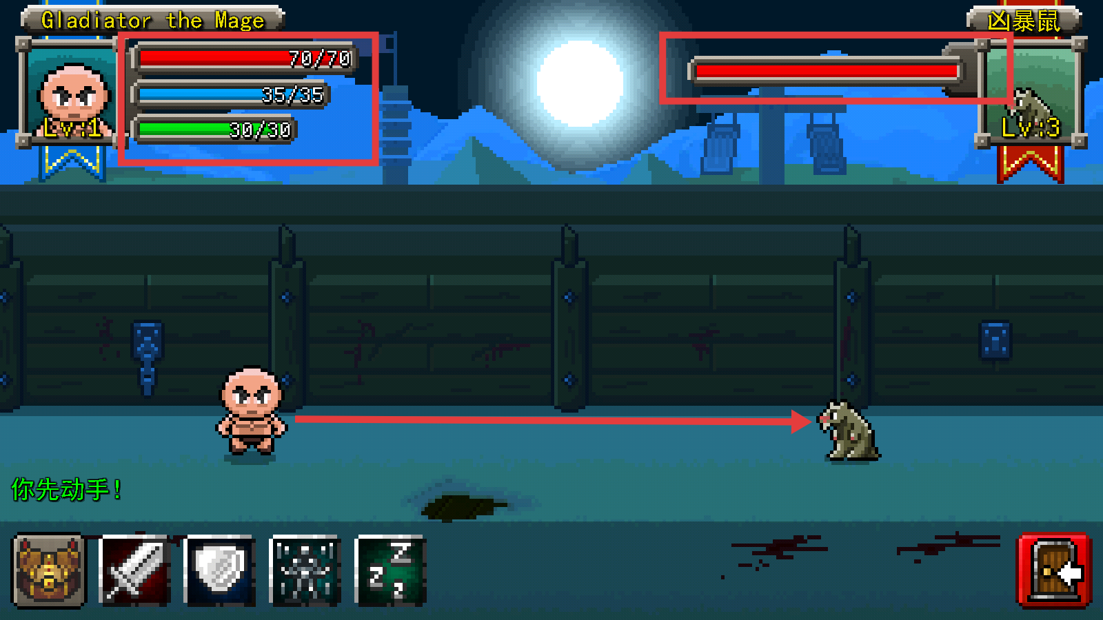 2、战斗开始前,留意自身【70/70】血量、【35/35】蓝量等属性,对手是【LV:3】凶暴鼠,要把握“你先动手”的先机。