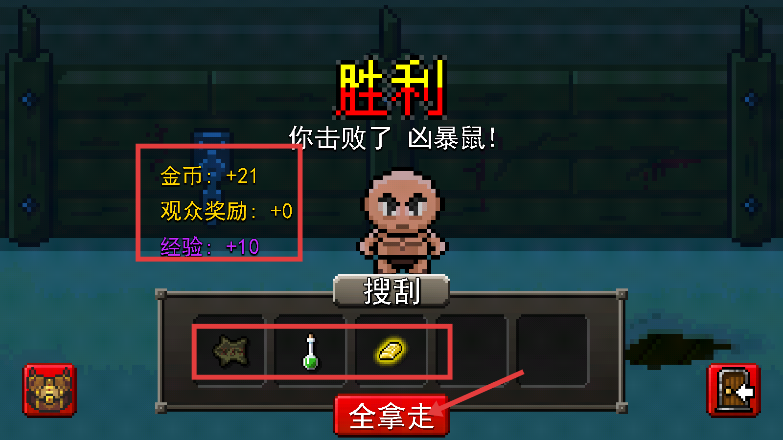 4、击败凶暴鼠后,会获得【金币:+21】【经验:+10】,记得点击【全拿走】,获取掉落的道具来积累资源。