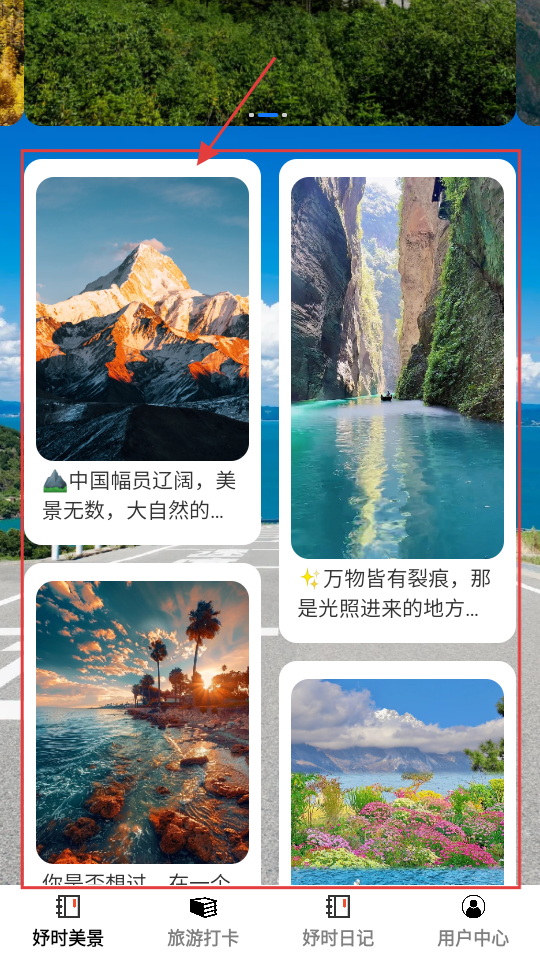 1、在【妤时美景】页面,有展示中国各类美景的卡片,可浏览不同风景介绍。