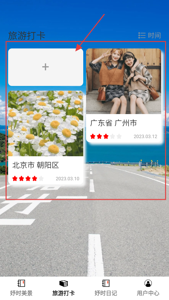 3、进入【旅游打卡】页面,可看到已有的打卡记录,如【北京市朝阳区】等地的打卡,还能点击“+”号新增打卡。