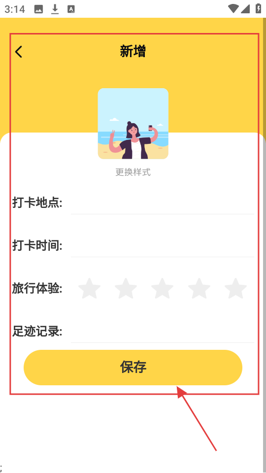 4、在新增打卡页面,可填写打卡地点、打卡时间,对旅行体验进行星级评价,记录足迹,填写完成后点击【保存】,记录旅游打卡信息。