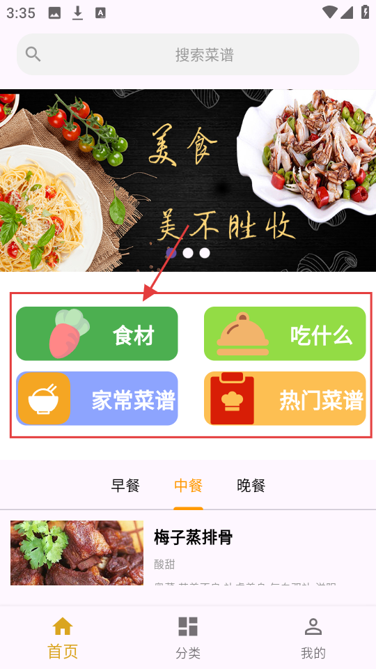 1、进入应用首页,有【食材】【吃什么】分类,可根据需求选择。