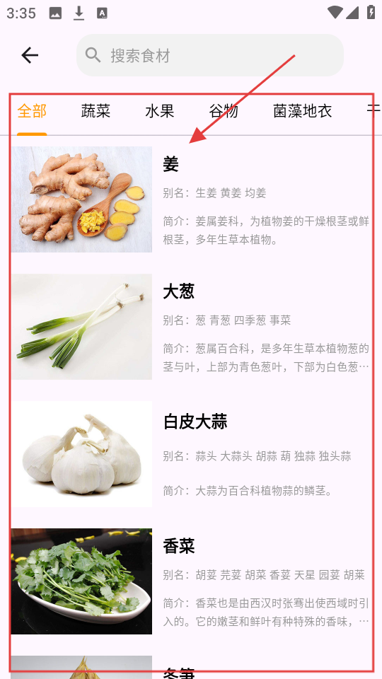 2、点击【食材】分类,可看到【姜】【大葱】等食材,方便查看食材相关信息。