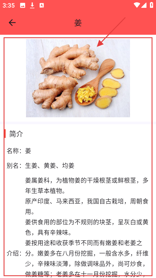 3、点击【姜】,可查看其别名【生姜】【黄姜】,以及姜属姜科,为多年生草本植物等简介内容。