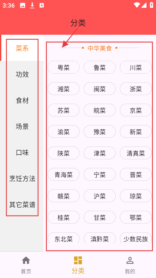 4、进入“分类”页面,有【菜系】等分类,在【菜系】分类下,有【粤菜】等中华美食菜系,可根据菜系查找对应的菜谱。