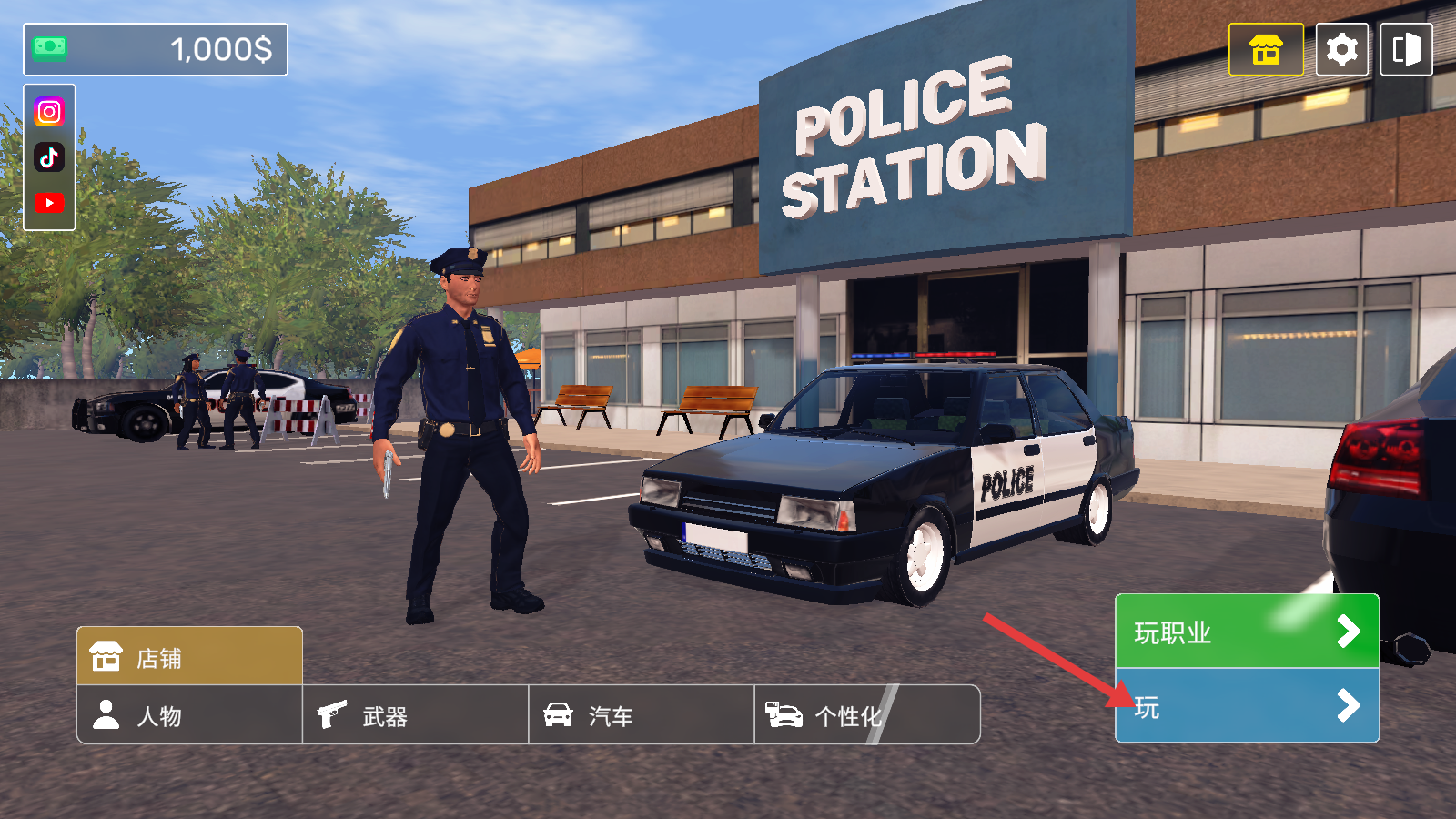 1、看到【POLICE-STATION】后,点击右下角“玩”按钮,可进入警察角色的游戏场景,初始有1000$资金。
