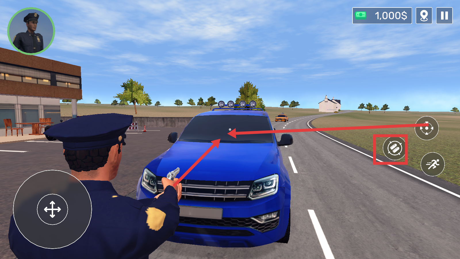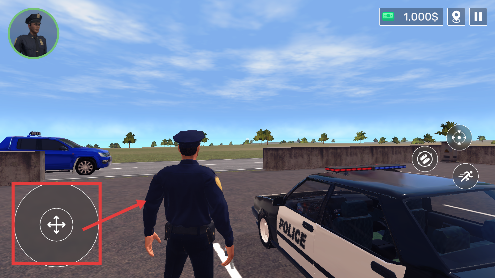 2、利用左侧带十字箭头的控制键,操控警察角色移动,熟悉场景内的警车和周边环境。