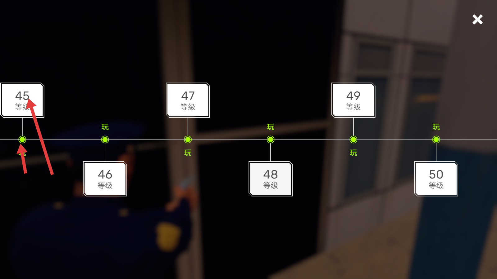 4、当前场景显示的是等级成长线,从45等级开始,通过点击“玩”推进,逐步解锁46到50等更高等级内容。