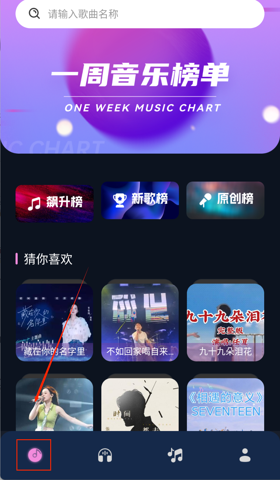 2、在首页可以浏览个性化推荐的歌单和热门音乐,也可以通过搜索框输入歌名、歌手或歌词来查找特定音乐,搜索结果会按相关度排序显示。