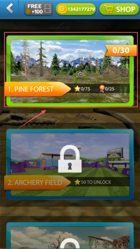 2、如何选择关卡?在主菜单点击“PINE FOREST”或“ARCHERY FIELD”,再点“1”即可进入对应场景。