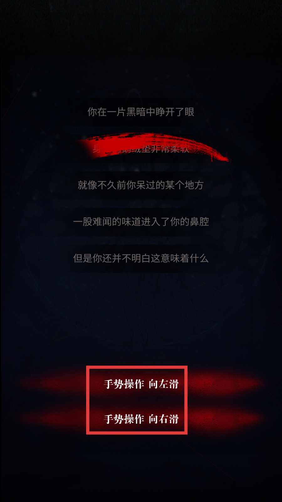 2、剧情推进时,会出现“你在一片黑暗中睁开了眼”等文字,需通过【手势操作-向左滑】或【手势操作-向右滑】来选择,推动故事发展。