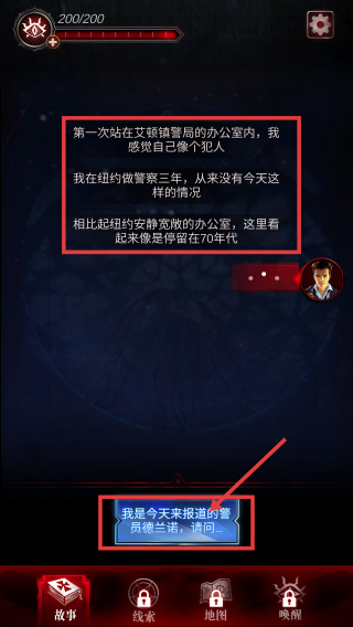4、当看到“第一次站在艾顿镇警局的办公室内…”的剧情时,点击【我是今天来报道的警员德兰诺,请问…】的对话选项,推进后续故事。