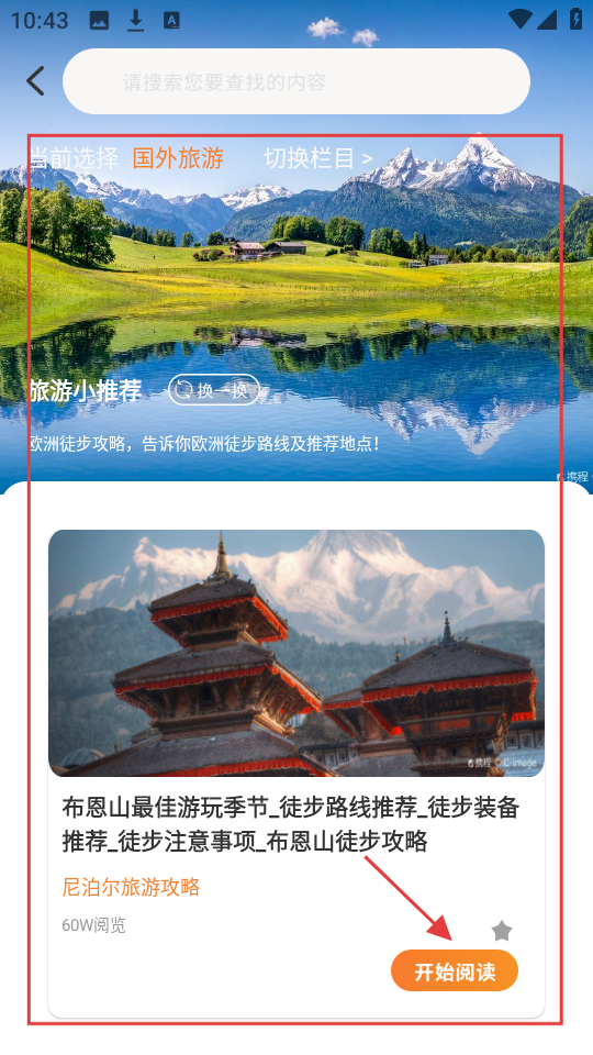 2、选择【国外旅游】分类,会有旅游小推荐,如欧洲徒步攻略、布恩山徒步攻略等,可点击【开始阅读】查看详情。