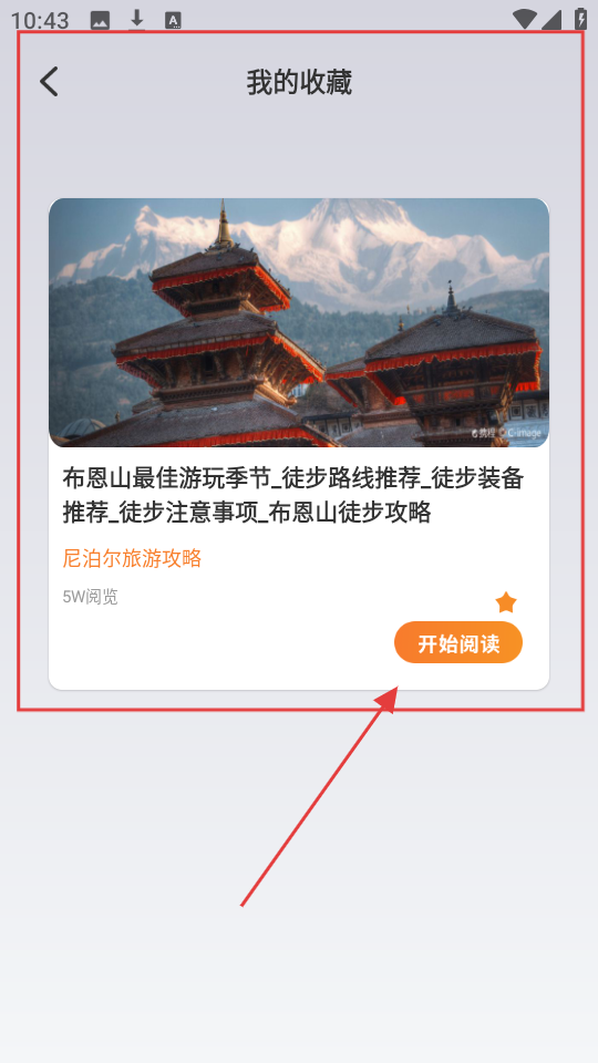 4、进入“我的收藏”页面,能看到已收藏的布恩山徒步攻略,可再次点击【开始阅读】查看。