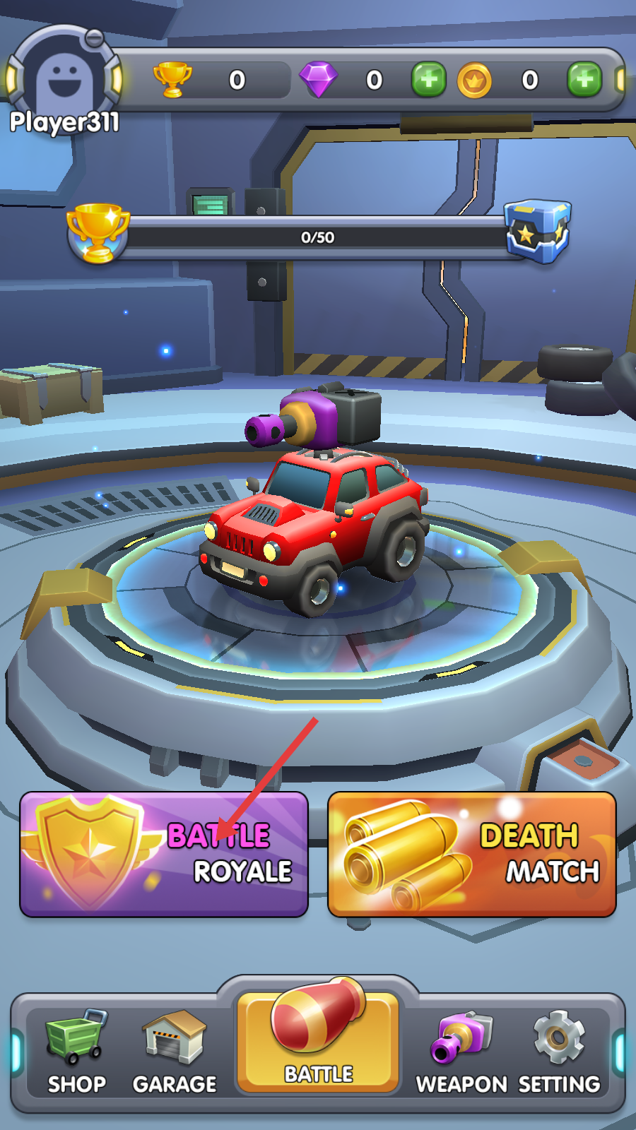 1、进入游戏后,选择【BATTLE-ROYALE】模式,准备驾驶红色武装小车参与对战,开启竞技挑战。