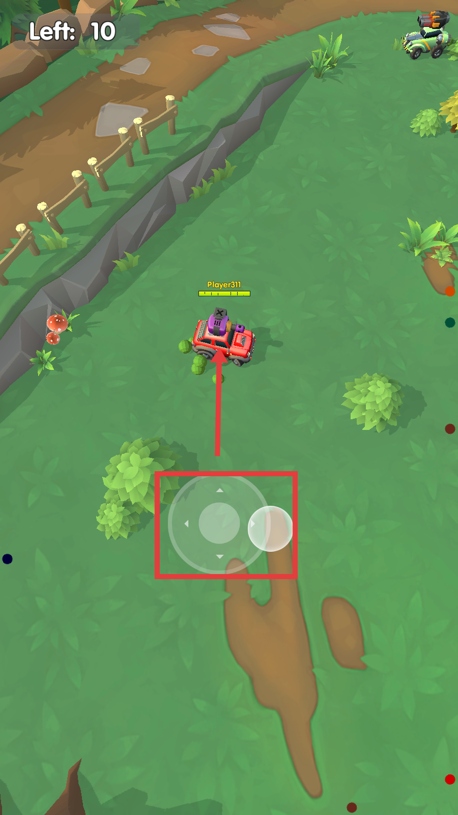 2、在对战场景中,通过下方虚拟摇杆操控小车移动,在绿色场地中探索并寻找对手。
