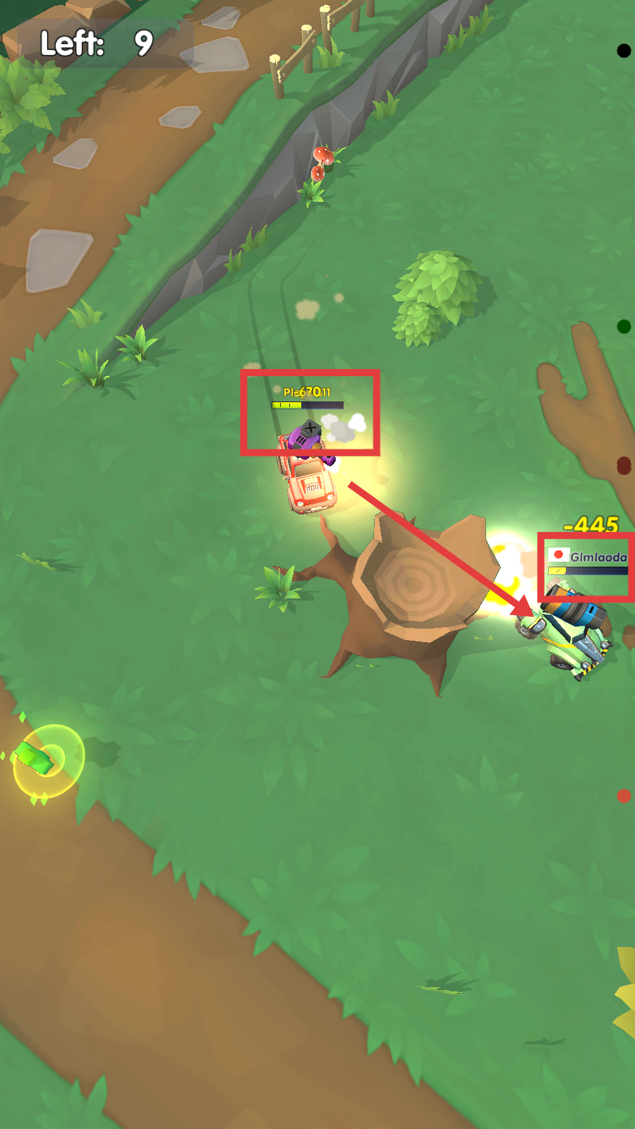 3、发现其他玩家的小车(如Gimlaoda的车)时,操控自己的小车发起攻击,可对敌方造成伤害(如-445)。