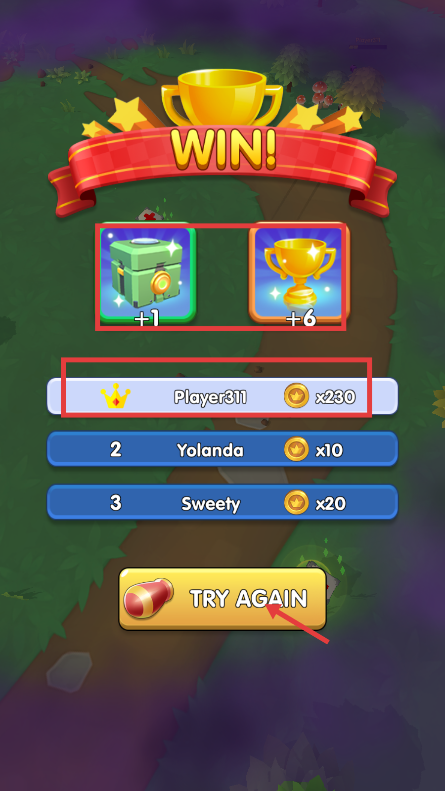 4、成功获胜后,会获得宝箱、奖杯(+6)以及金币(如Player311获得×230),点击【TRY-AGAIN】可继续挑战。